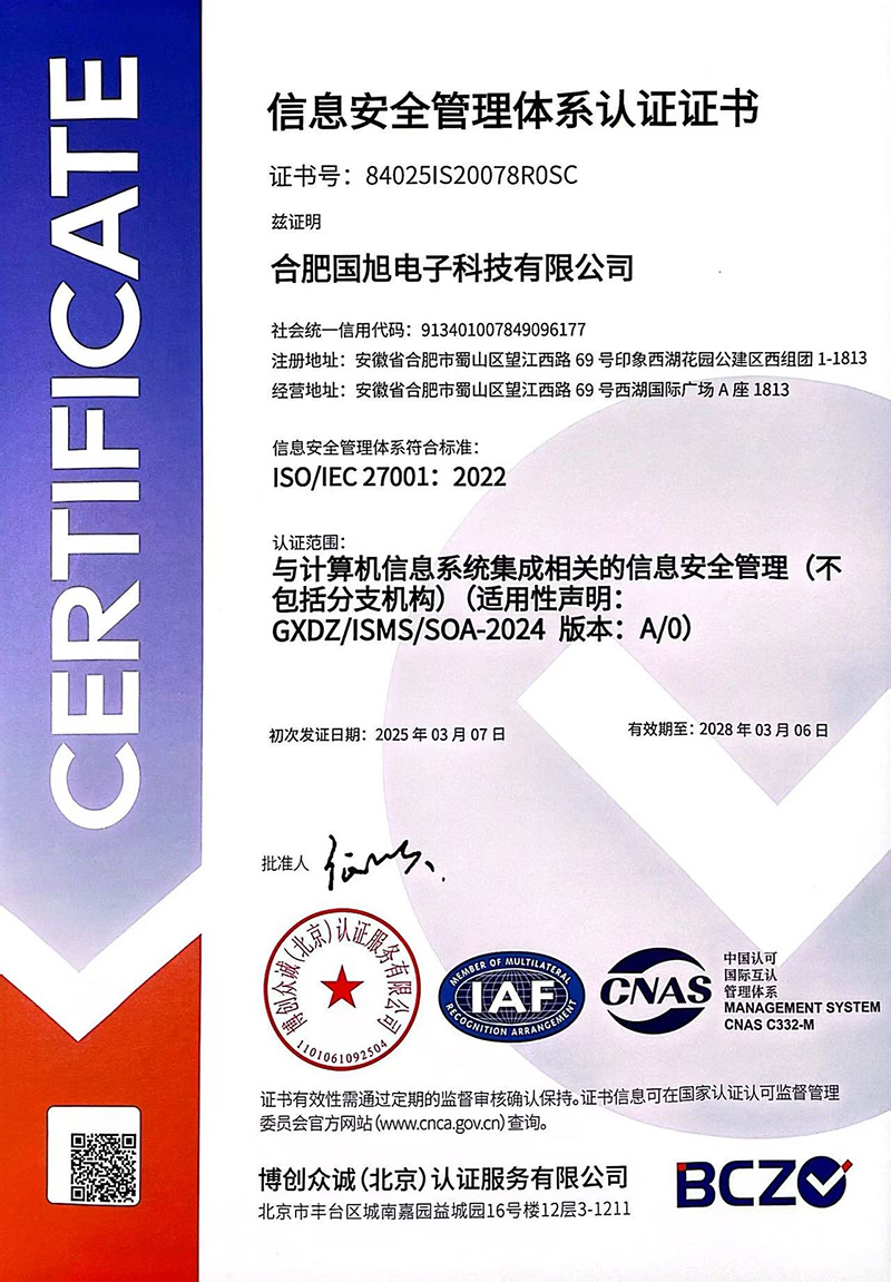 合肥國(guó)旭電子科技有限公司創(chuàng)立于2006年,總注冊(cè)資本2008萬(wàn)。公司總部地址位于安徽IT主流商圈核心,合肥市蜀山區(qū)望江西路與肥西路交口西湖國(guó)際廣場(chǎng)。 公司是專業(yè)從事智能防雷檢測(cè)系統(tǒng)、智能化工程設(shè)計(jì)與施工工程、防雷設(shè)計(jì)施工工程、數(shù)據(jù)中心機(jī)房、消防工程、網(wǎng)絡(luò)監(jiān)控安全技術(shù)防范工程、及智能變電站安全預(yù)警系統(tǒng)。